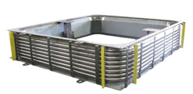 特點(diǎn):鉸鏈型膨脹節(jié)包含鉸鏈和銷軸,允許補(bǔ)償單元在平面內(nèi)彎曲變形;壓力推力由鉸鏈系統(tǒng)承受;復(fù)式鉸鏈形式可吸收平面內(nèi)的橫向位移