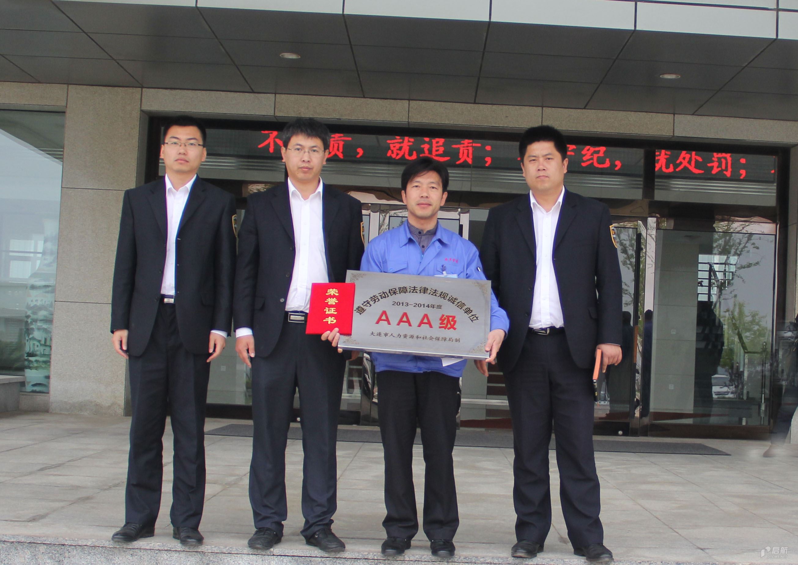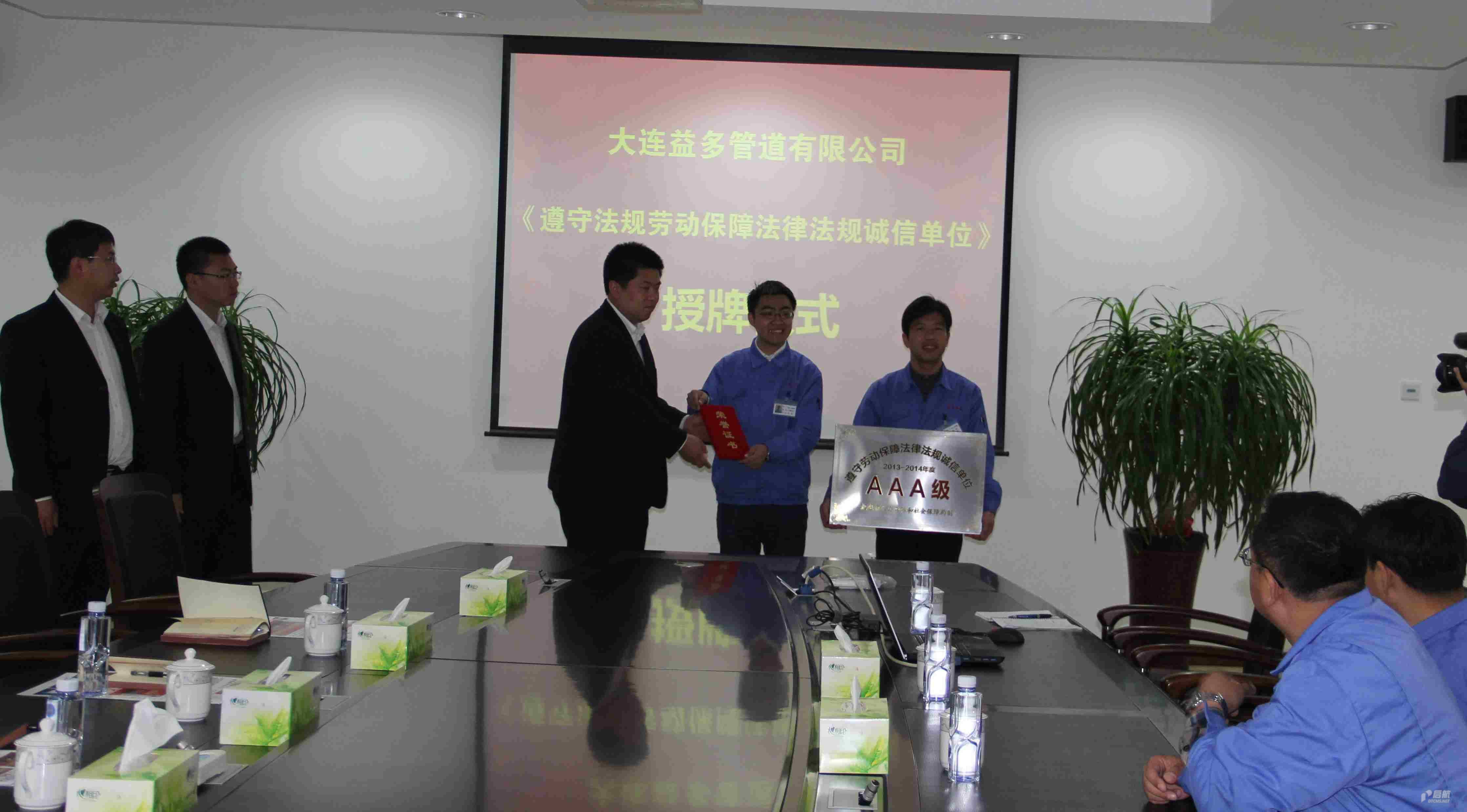 大連益多管道有限公司被評(píng)為大連市2013-2014年度AAA級(jí)勞動(dòng)保障法律法規(guī)誠(chéng)信單位。5月12日上午,長(zhǎng)興島經(jīng)濟(jì)區(qū)勞動(dòng)監(jiān)察大隊(duì)代表大連市人力資源和社會(huì)保障局為我公司授牌。行政人力資源部部長(zhǎng)馬驥代表公司接受了牌匾,副總經(jīng)理寧國(guó)華、總經(jīng)理助理王強(qiáng)出席授牌儀式。
