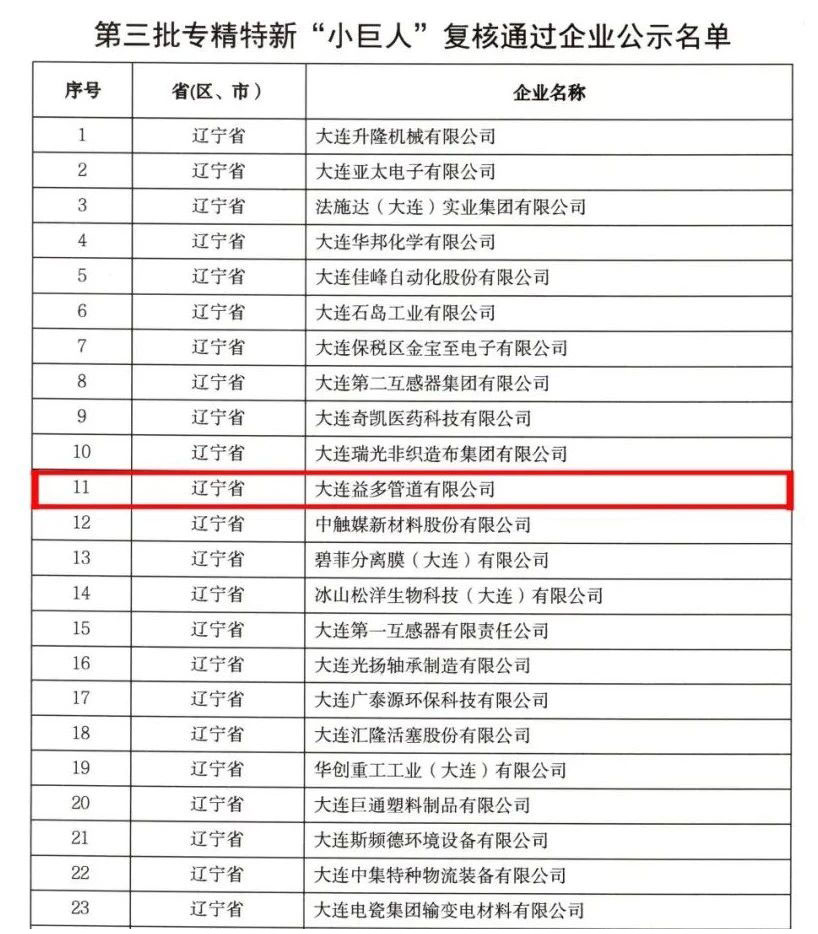 近日,工業(yè)和信息化部發(fā)布《第六批專精特新“小巨人”企業(yè)和第三批專精特新“小巨人”復(fù)核通過企業(yè)名單》,大連益多管道有限公司通過第三批專精特新“小巨人”復(fù)核,再度榮登榜單,連續(xù)獲此殊榮!