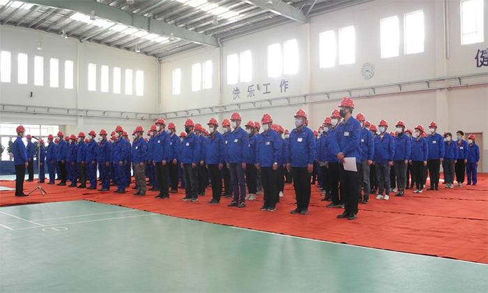2020年4月14日,大連益多管道有限公司全體員工在體育館召開2020年安全生產(chǎn)誓師大會(huì)。